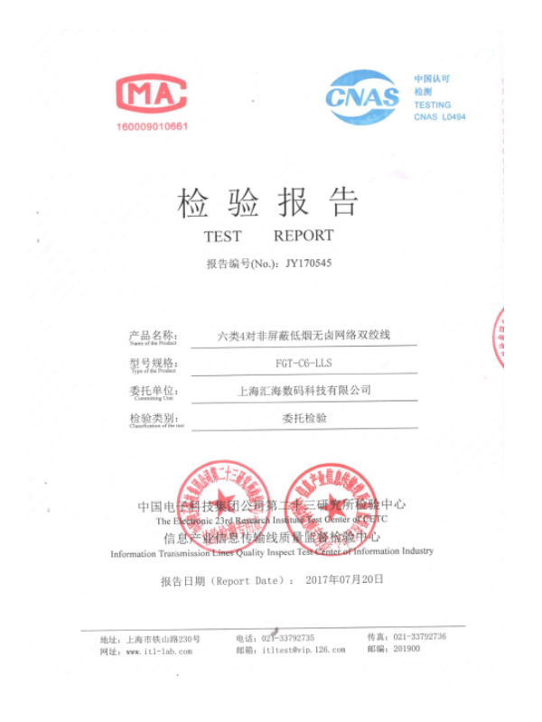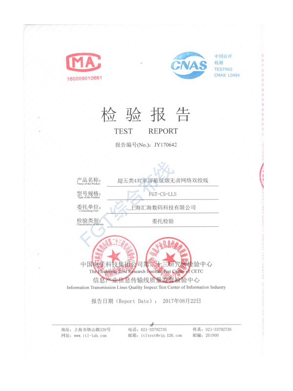 超五類非屏蔽低煙無鹵檢測報告