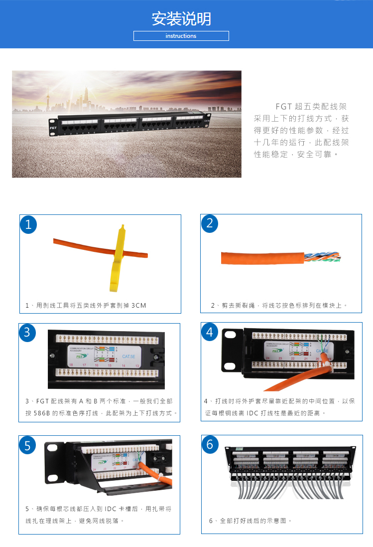 FGT 24口超五類非屏蔽網絡配線架執行标準:YD/T 926.3ISO/IEC 11801 ANSI/TIA-568.2-D。支持話(huà)音通訊系統、10Base – T、16 Mbps 、100Base – T、155Mbps和622 Mbps ATM 、1000 Mbps、多媒體(tǐ)等方面的高速應用。