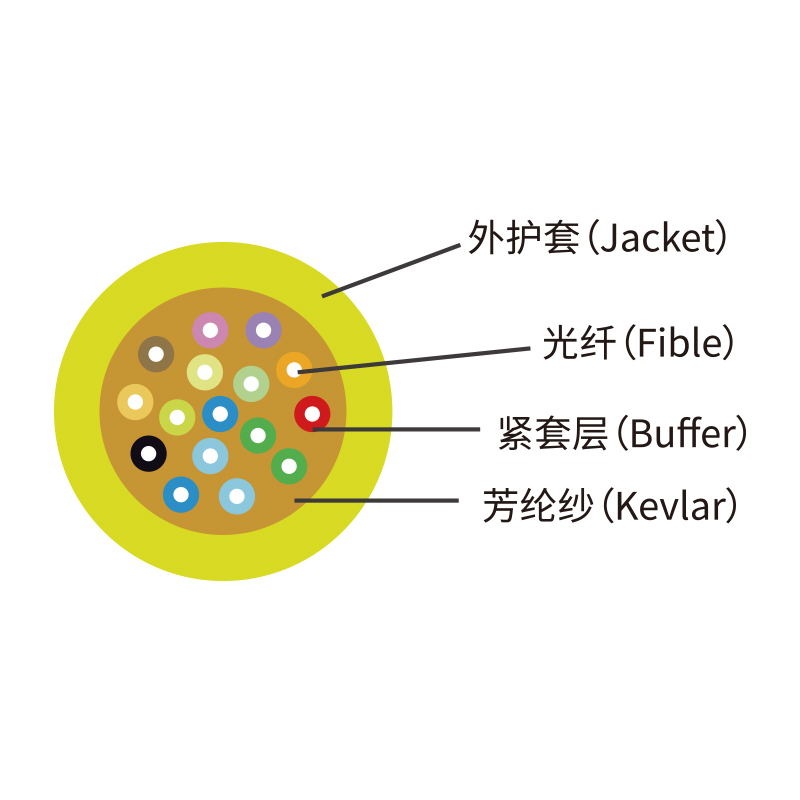 室内光(guāng)纜是在緊套光(guāng)纖外均勻增加加強作(zuò)用的多股芳綸絲,再擠阻燃外護套而成.