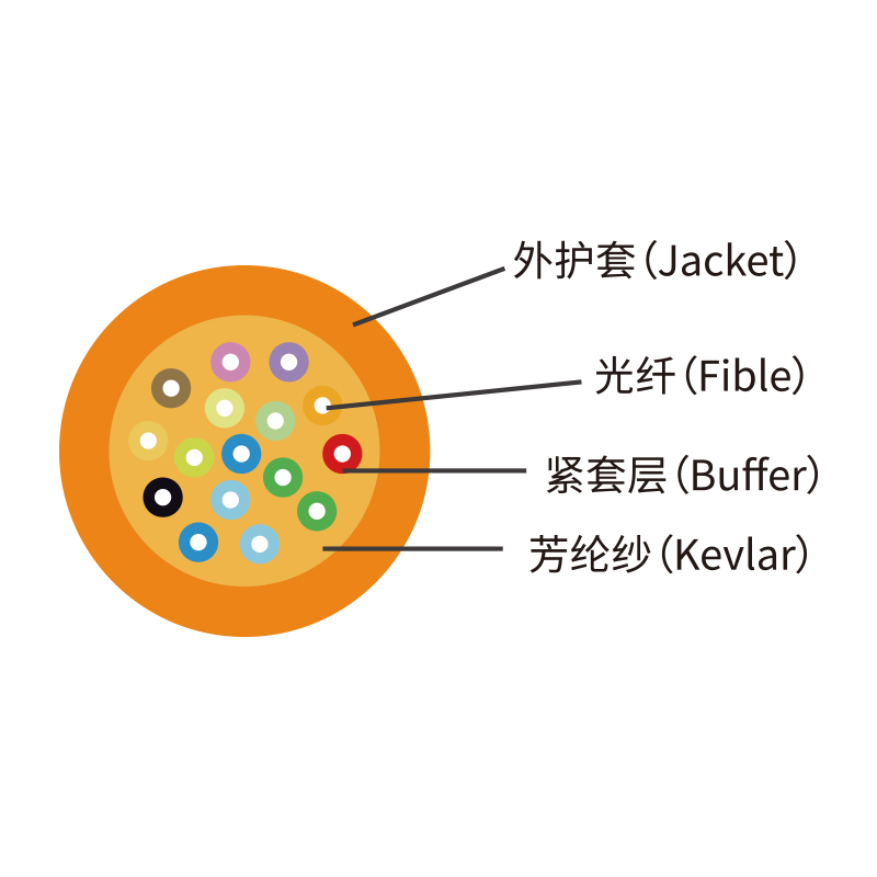 室内光(guāng)纜是在緊套光(guāng)纖外均勻增加加強作(zuò)用的多股芳綸絲,再擠阻燃外護套而成.